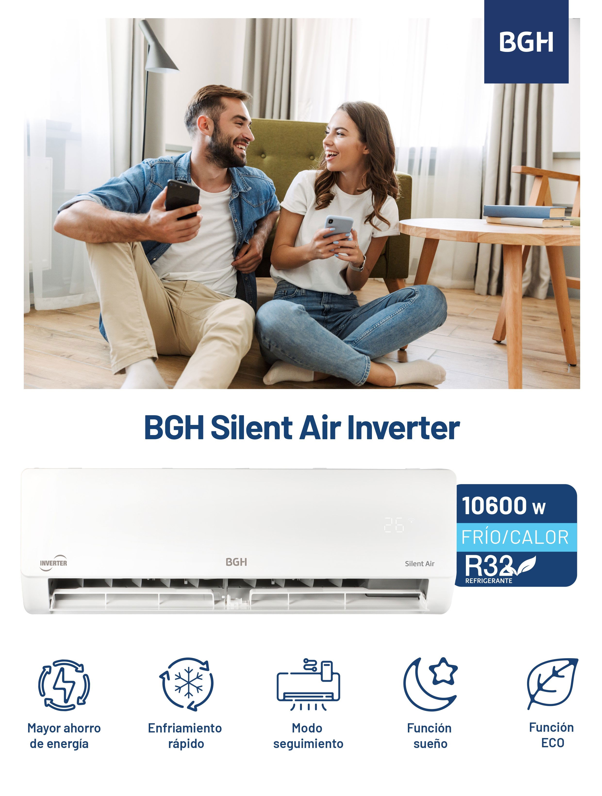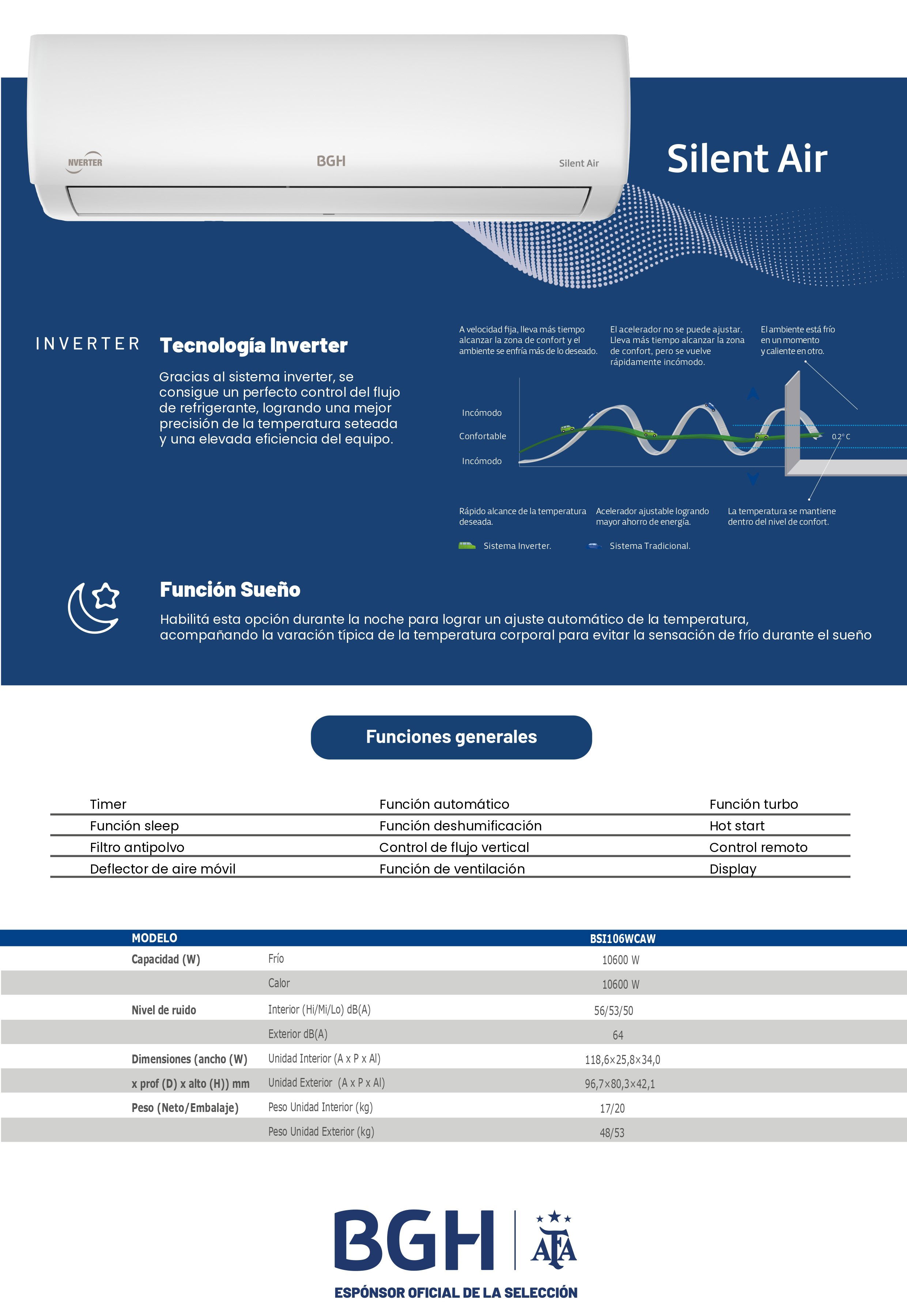» Tecnología Inverter: La tecnología Inverter regula la potencia del equipo, logrando un importante ahorro de energía. El aire acondicionado BGH regula la potencia del compresor dependiendo de la temperatura del ambiente y la necesidad de frío o calor, brindando mayor confort, menor nivel de ruido y de consumo de energía.