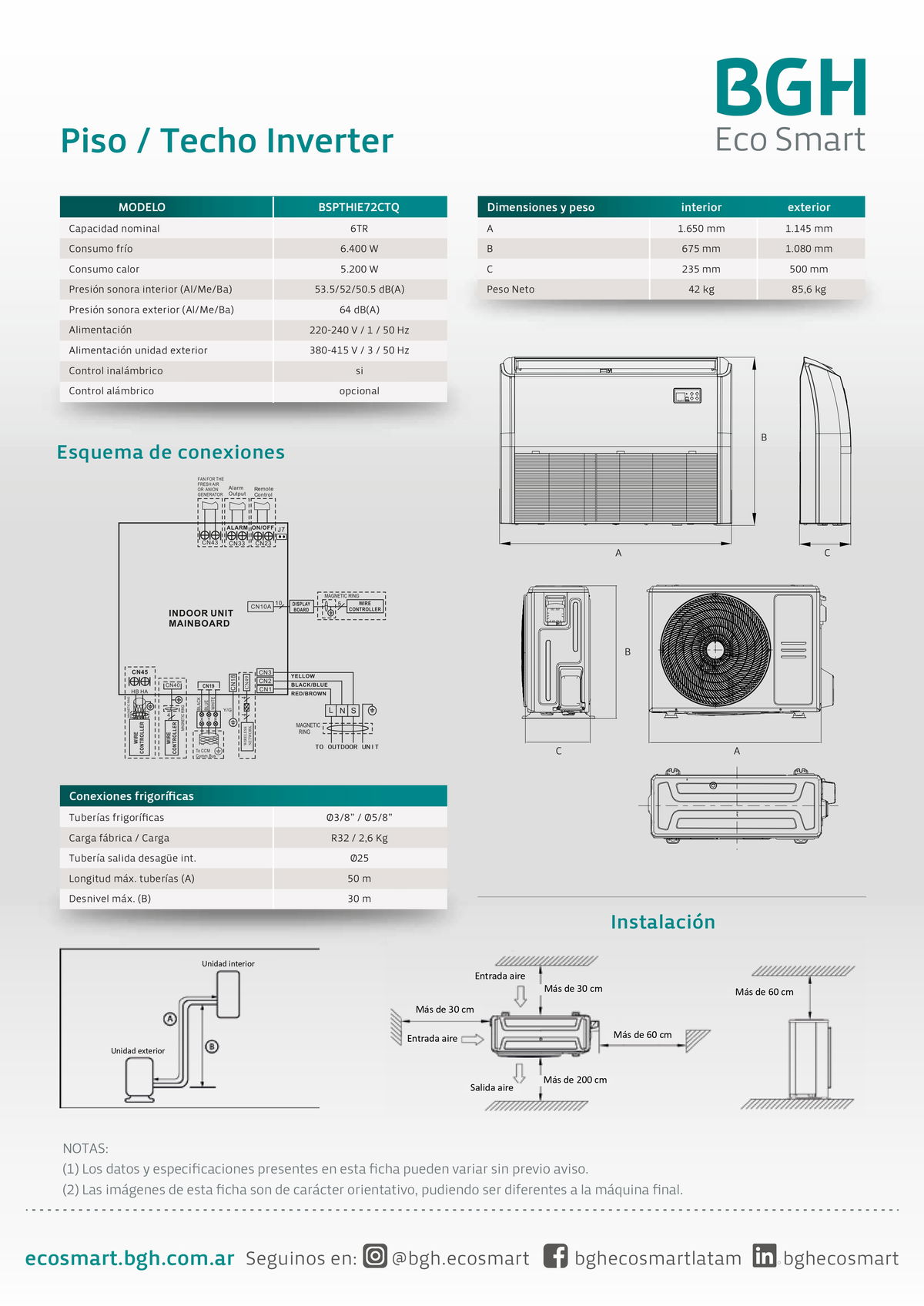 • Unidad Exterior: 114,5 cm (ancho) x 108 cm (alto) x 50 cm (profundidad). Peso: ~85,6 kg.