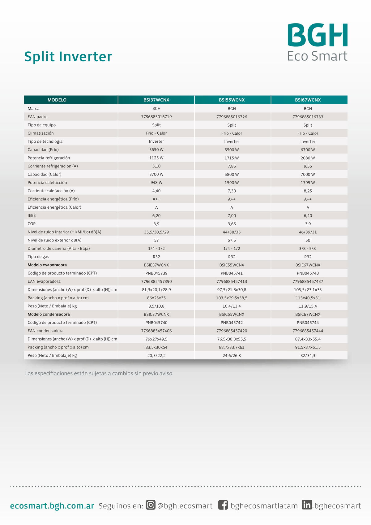 - Tecnología Inverter para mayor eficiencia energética y ahorro de consumo.