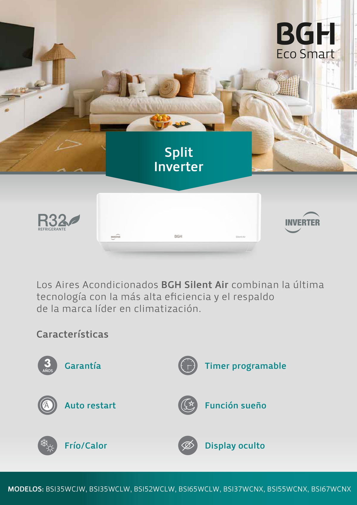 El Aire Acondicionado Split Frío/Calor BGH Inverter BSI55WCNX está pensado para ofrecer confort durante todo el año, brindando un equilibrio perfecto entre rendimiento y eficiencia. Gracias a su tecnología Inverter, este equipo reduce el consumo eléctrico al ajustar de forma automática la potencia del compresor, manteniendo la temperatura deseada sin fluctuaciones bruscas. Ideal para ambientes amplios, combina alta capacidad de refrigeración y calefacción con un funcionamiento silencioso y estable. Sus múltiples funciones —como el modo Turbo para enfriamiento rápido, el sistema Autolimpiante que evita la acumulación de humedad y bacterias, y el filtro antibacterial— lo convierten en un aliado para disfrutar de un aire más saludable. Además, su gas refrigerante R32 es más eficiente y amigable con el medioambiente, mientras que el control remoto con pantalla LCD asegura un uso cómodo y sencillo.