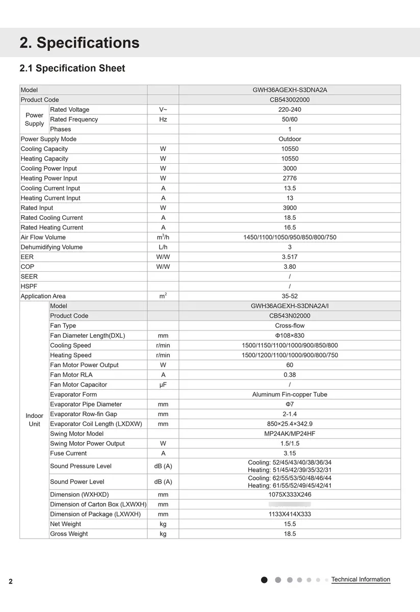 Unidad interior: 107 x 24,6 x 33,3 cm | Peso: 15,5 kg